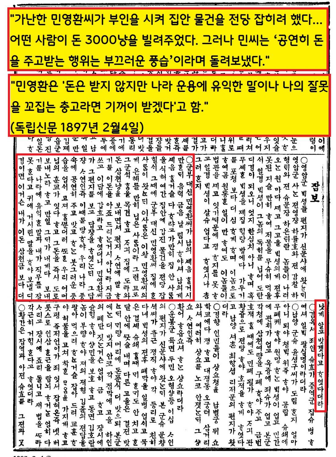 독립신문 등에는 민영환 관련 미담기사가 봇물을 이룬다. 그 중에는 가난했던 민영환을 위해 누군가 돈을 빌려주려 하자 민영환이 “공연히 돈을 주고받는 행위는 부끄러운 풍습”이라고 돌려보냈다”는 기사가 나온다. 이때 민영환은 “돈은 받지 않지만 나라 운용에 유익한 말이나 나의 잘못을 꼬집는 충고라면 기꺼이 받겠다”고 덧붙였다.(1897년 2월4일)