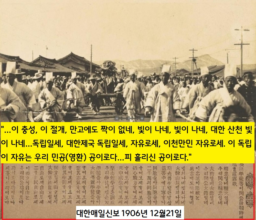 “어화 우리 학도들아. 이내 말씀 들어보소, 대한동포 합심기초 민충정의 공로로다…보답하세. 보답하세. 민충정공 보답하세. 잊지마세, 충의 두 자, 잊지마세.”(대한매일신보 1906년 8월3일 등)