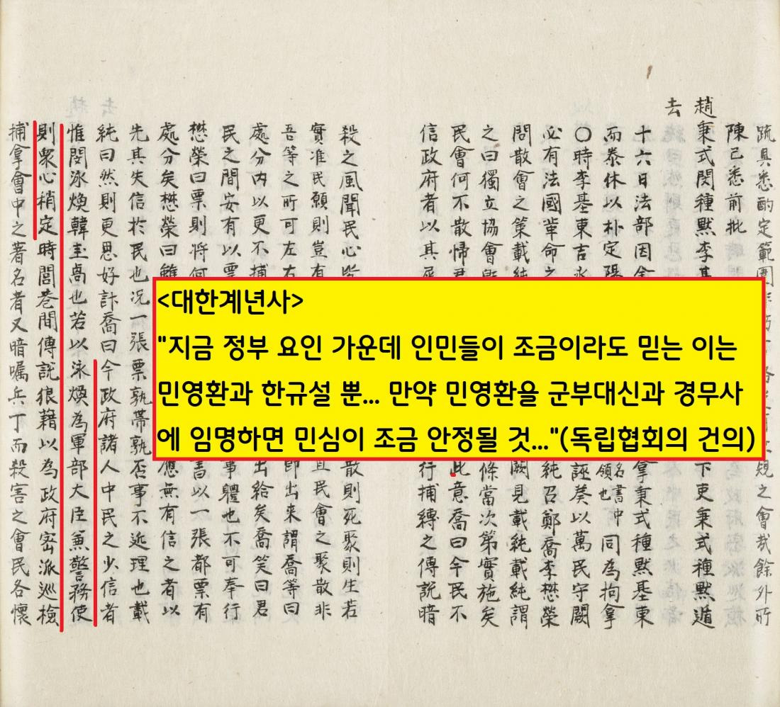 1898년 10월 독립협회는 궁내부대신 이재순(1851~1904)을 통해 “정부 요인 중 인민들이 가장 믿는 이는 한규설(1848~1930)과 민영환 뿐”이라고 역설했다. 이 즈음 독립신문 등에는 민영환 관련 미담기사가 봇물을 이룬다.
