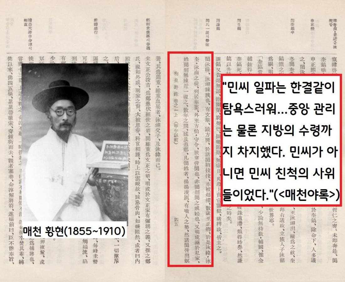 매천 황현(1855~1910)은 “민씨 일파는 한결같이 탐욕스러워…중앙 관리는 물론 지방의 수령까지 차지했다”(<매천야록>)고 민씨의 권력 독점과 탐학을 비판했다.