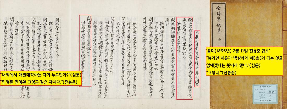 1895년 음 2월11일의 ‘전봉준 공초기록’. 체포된 동학혁명 지도자 전봉준은 “매관매직을 일삼는 자들을 타도하려 거사했다”면서 ‘민영준, 민영환, 고영준’ 등 구체적인 이름을 거명했다.|규장각한국학연구원 소장