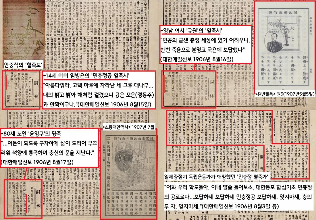 1906년 7월10~1907년 2월10일 사이 7개월간 각 신문과 잡지 등에 ‘혈죽’을 소재로 실린 한시만 해도 47제에 달한다. 14세 소년부터 80대 노인, 또한 지방의 여성들까지 앞다퉈 ‘혈죽시’를 지어 언론사에 보냈다. 그중 인천 영화학교 학생 8명이 지은 ‘민충정 혈죽가’는 일제강점기 내내 만주의 독립운동가 사이에서 애창되었다.