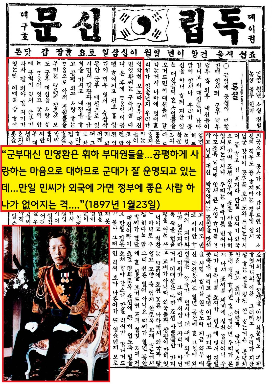 민영환이 유럽 방문을 위해 군부대신직에서 물러나자(1897년 1월) 독립신문은 “군부대신 민영환은 휘하 부대원들을…공평하게 사랑하는 마음으로 대하므로 군대가 잘 운영되고 있는데…만일 민씨가 외국에 가면 정부에 좋은 사람 하나가 없어지는 격….”(1897년 1월23일)이라고 유감의 뜻을 표했다.