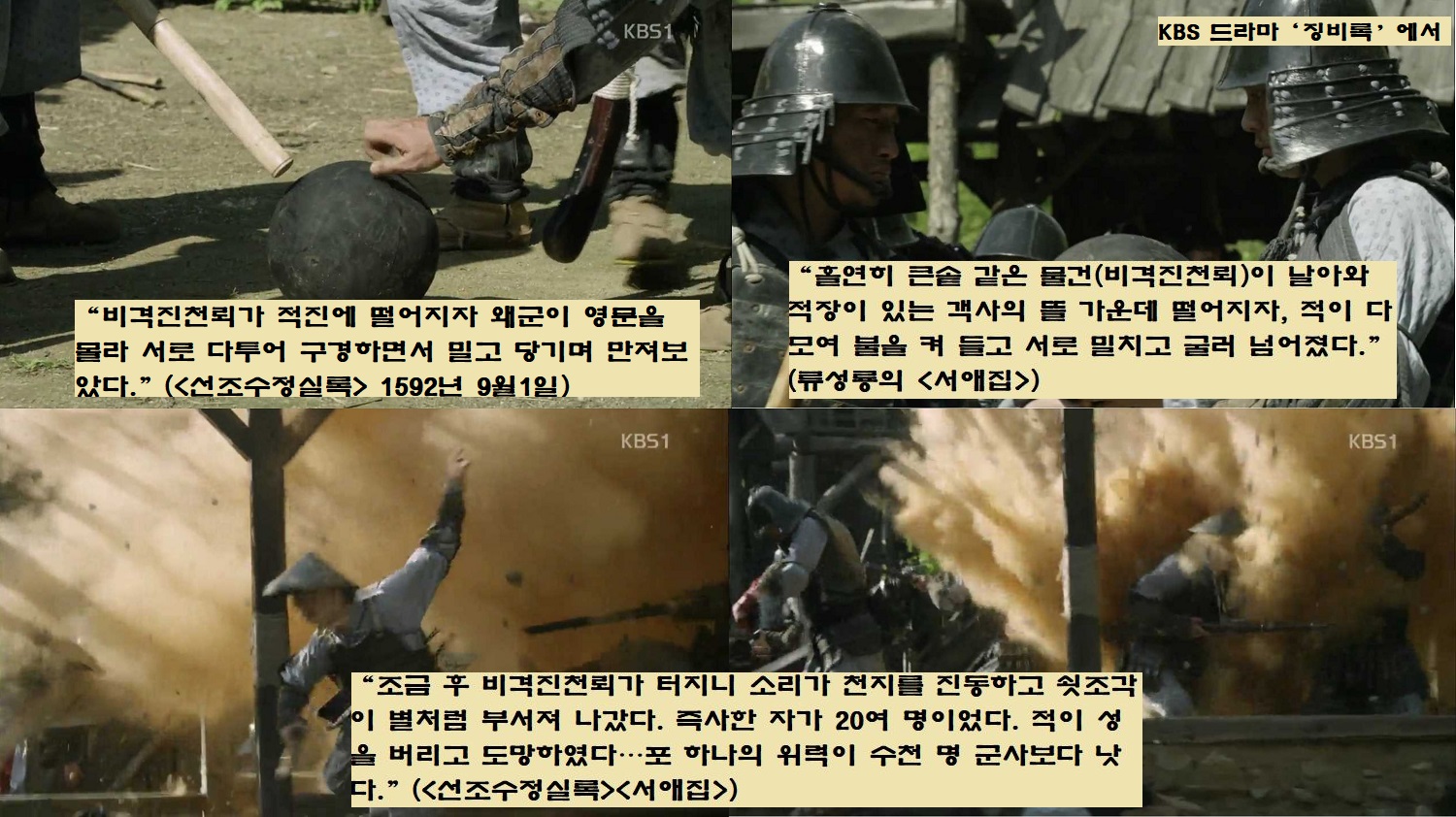 <연려실기술>은 “비격진천뢰가 터지자 왜군의 진중에서 놀라고 두려워서 ‘귀신의 조화’라고 하면서 성을 버리고 도망갔다”고 기록했습니다. 일본군은 비격진천뢰를 ‘귀신폭탄’이라 하며 부들부들 떤겁니다.