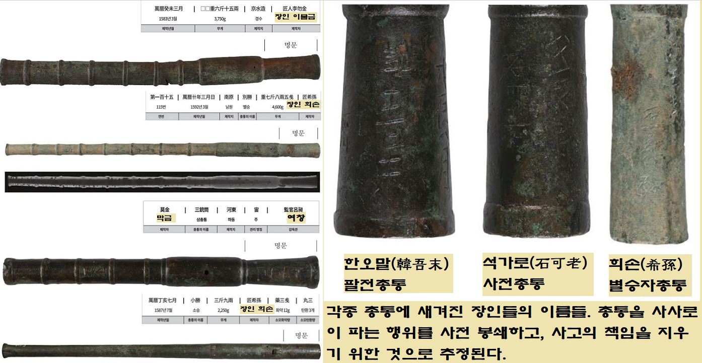 이번 진주 박물관 특별전을 계기로 실록이나 주요 문헌에는 기록되지 않은 무기기술자들의 이름을 한분한분 거론하려 합니다. 이분들은 지금까지 남아있는 총통 등 무기에 이름을 새긴 기술자들입니다. 그 분들의 분투에 박수를 보내고자 합니다. ‘천중원, 김우경, 막금, 신산, 희손, 준금, 한오말, 석가로, 김영환, 유신…’ 경향신문 히스토리텔러