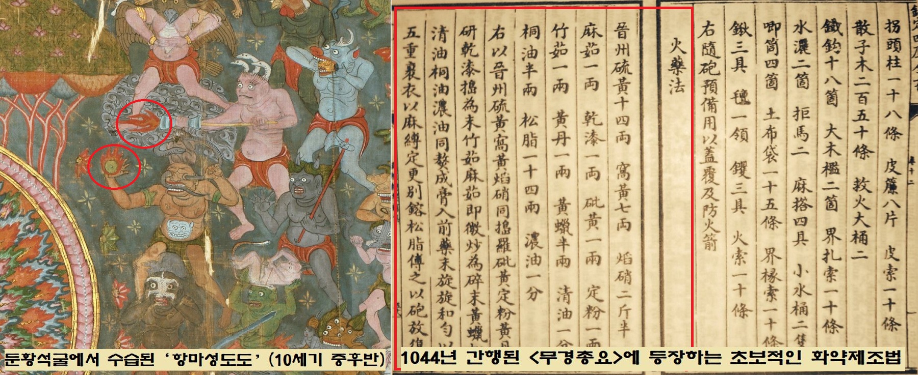 화약은 도교사상이 유행한 중국 한나라와 위진남북조 시대에 연단술(煉丹術)의 하나로 사용되었는데요. 연단술은 금단(광물로 만든 약)을 조제·복용하는 신선도술이죠. 불로불사를 원한 도사들이 사용한 팔석(八石·염초·주사·웅황·운모·공청·유황·융염·자황) 중에 화약의 재료인 염초(초석)와 유황 등이 포함되어 있습니다.