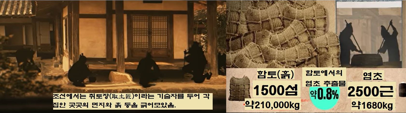 그러나 조선에는 분뇨광산도, 염초밭도 없었습니다. 그래서 화장실이나 동굴, 마루밑, 아궁이, 처마밑 속 흙 등에서 염초 성분을 찾아야 했습니다. 그랬기에 취토장(取土匠)이라는 기술자를 두어 각 집안 곳곳의 먼지와 흙 등을 긁어모았습니다.