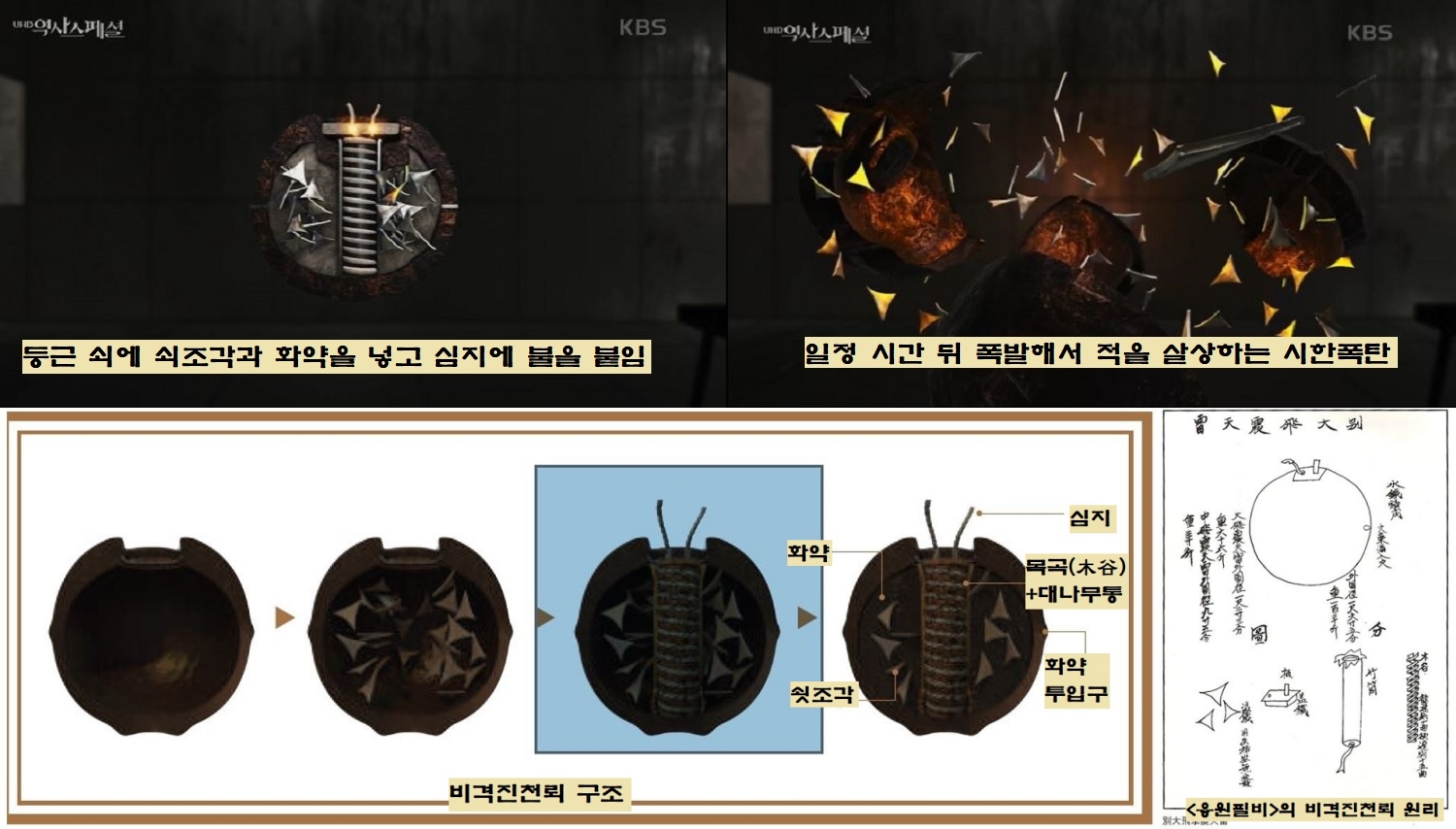 오늘날과 같은 신관(발화) 장치가 있어서 목표물까지 날아가 폭발하면서 천둥 번개와 같은 굉음과 섬광, 그리고 수많은 파편(마름쇠·삼각형 형태의 쇠조각)을 쏟아내는 작렬탄이었습니다. 시간을 조절해서 폭발한다는 면에서 시한폭탄이라 할 수 있는데요.