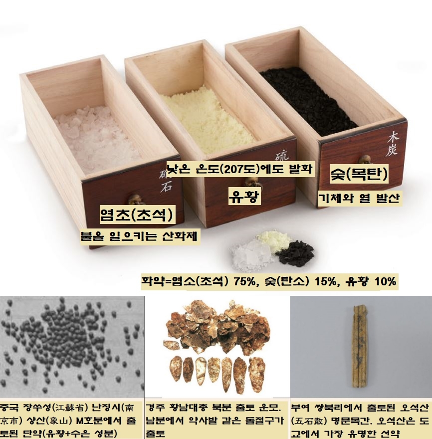 화약은 9~10세기 무렵부터 중국 송나라 때부터 무기로 활용되었는데요. 그러나 그 이전에도 화약은 제조되었답니다. 화약은 염초(초석 혹은 질산칼륨·KNO3)와 숯, 유황을 혼합해서 만들죠.
