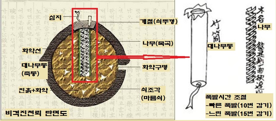 비격진천뢰의 원리 구조는 의외로 간단합니다.(<융원필비>·1813년) 둥그런 무쇠 속에 대나무통(竹筒)을 꽂고 대나무 통 안에 나선형의 홈을 파놓은 나무(木谷)에 도화선을 10~15번 칭칭 감습니다. 이어 별도로 뚫은 무쇠 구멍 안에 화약과 마름쇠(삼각형 쇠), 흙을 잔뜩 넣고 화포에 장착합니다. 그런 다음 비격진천뢰의 도화선과 화포의 도화선에 차례로 불을 붙인 다음 발사하는데요. 10~15번 감은 도화선이 폭발시간을 조절하게 됩니다.