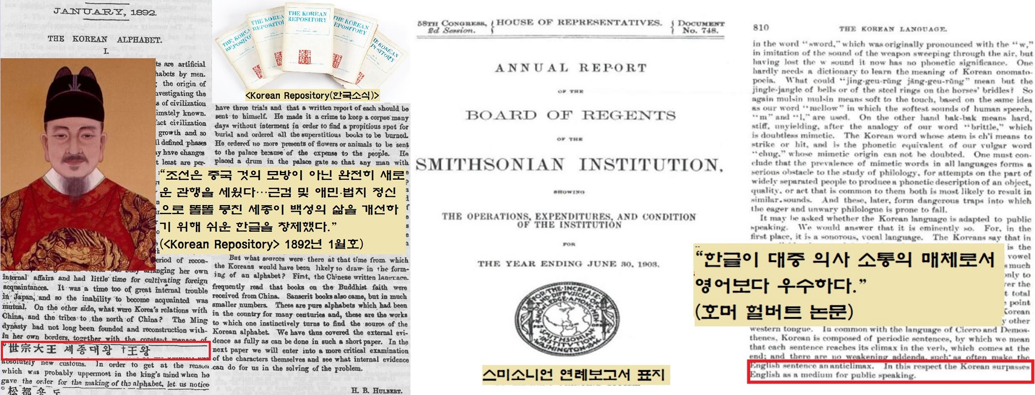 “근검 및 애민·법치 정신으로 똘똘 뭉친 세종이 백성의 삶을 개선하기 위해 쉬운 한글을 창제했다”(<한국소식·Korean Repository’·1892년>)고 하는가 하면 “문자의 단순성과 발성의 힘에서 한글과 견줄 문자는 세상 어디에도 없다. 세종은 고대 페니키아 문자를 그리스에 전한 카드모스 왕자에 조금도 뒤지지 않는다”(<한국사>·1905년)고 극찬했습니다.