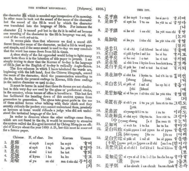 ‘이두’를 분석한 논문(‘The ITU’)을 발표했고(<한국소식>·1898년), “한국어는 영어보다 대중연설언어로 더 우수하다”(<한국평론·The Korea Review)>고 설파했습니다. 1903년에는 ‘훈민정음 서문’을 영어로 옮기기도 했습니다.