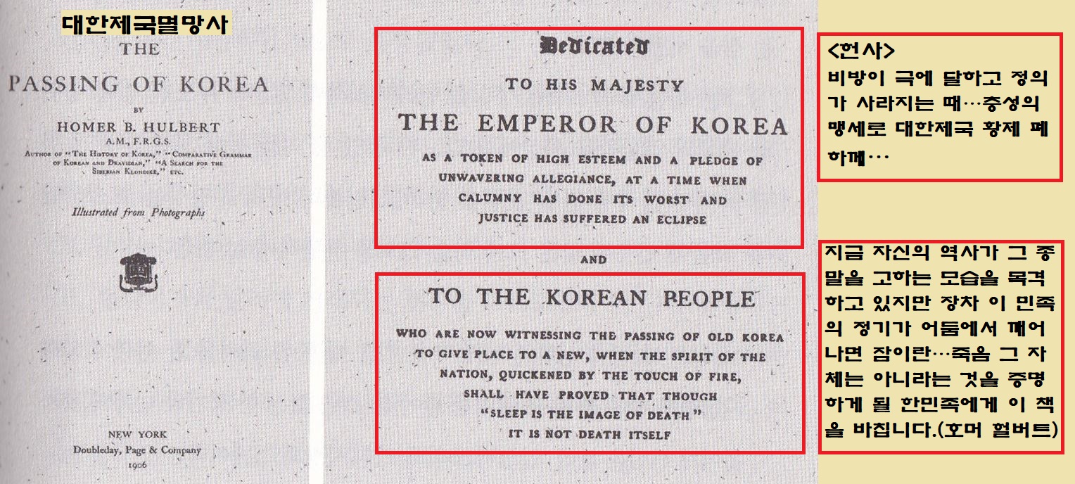 헐버트 박사가 1906년 <대한제국멸망사>를 출판하면서 남긴 헌사의 제목은 ‘대한제국 고종황제와 한민족에게 이 책을 바친다’는 것이었습니다.