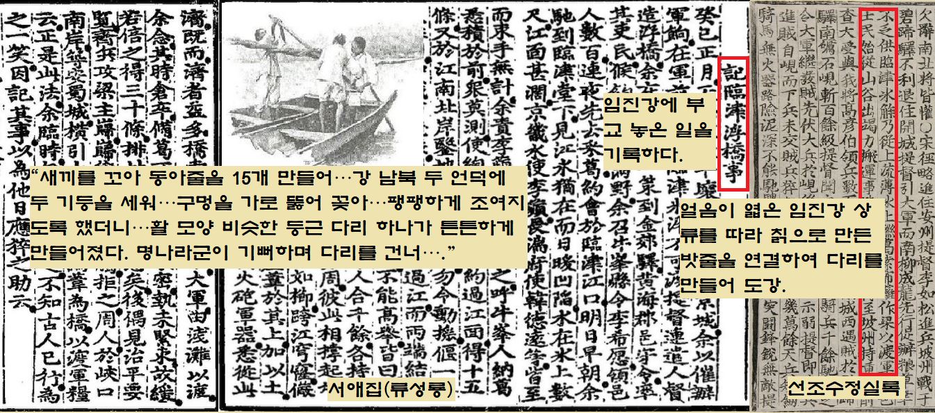 임진왜란 당시 조선·명나라 연합군이 임진강에 도달했을 때 칡넝쿨로 나무를 묶고, 나룻배로 활용해서 120야드(110m) 가량의 다리를 건설하여 12만명이 무사히 건넜다는 겁니다. 최초의 현수교라는 거죠. 제가 문헌기록을 찾아봤더니 실제로 “조·명 연합군이 임진강 상류를 따라 칡으로 만든 밧줄을 연결해서 다리를 만들어 도강했다”(<선조수정실록>(1593년 1월 1일)·류성룡(1542~1607)의 <서애집>)는 기록이 보이더군요.