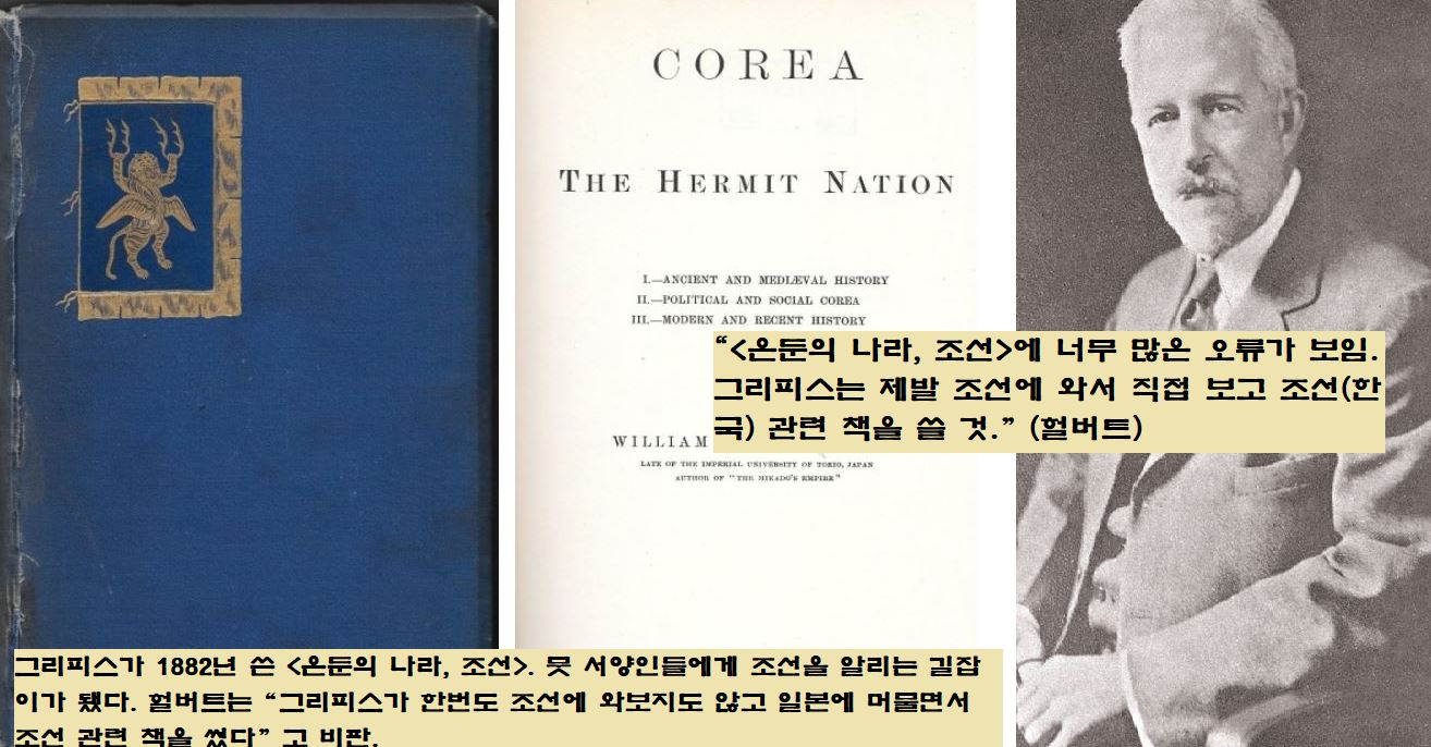 그러나 1886년(고종 23) 육영공원(왕립영어학교) 교수로 입국한 이래 조선을 제2의 조국으로 삼았던 헐버트가 보기에 그리피스는 문외한에 불과 했습니다. 헐버트는 특히 “1882년 출간된 이 책(<은둔의 나라>)는 너무 많은 오류를 안고 있다”고 지적하면서 “그리피스가 한번도 조선(대한제국)에 와보지도 않고 일본에 머물면서 조선 관련 책을 썼다”고 비판했습니다. 일본에 앉아 일본·중국·서양 자료를 토대로 쓴 조선 이야기니 왜곡·편향될 수밖에 없다는 거죠.