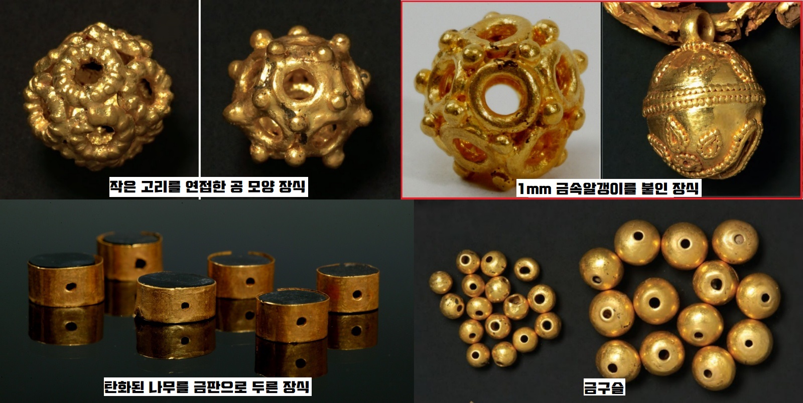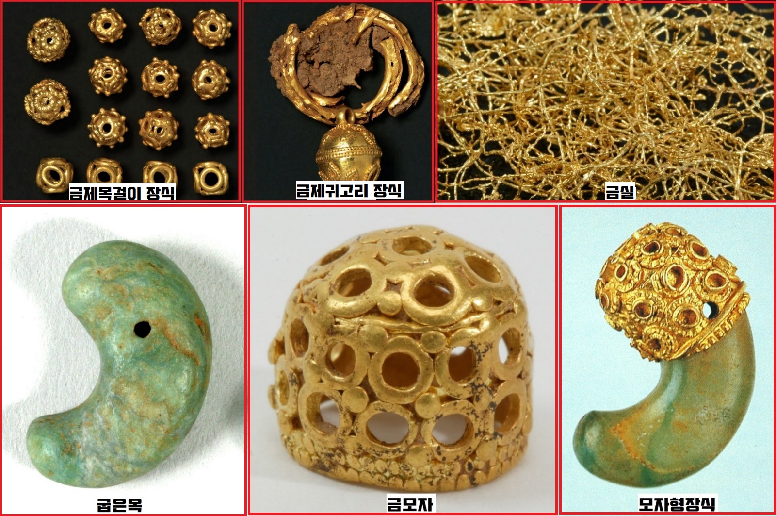 굽은옥(곡옥)의 머리를 씌운 모자형 장식(금모장식)과 작은 고리를 연접하여 만든 공모양 장식, 탄목(탄화된 나무)을 장기알처럼 깎고 가장자리에 금판을 덧씌운 장식 등은 세밀하기 이를데 없습니다.