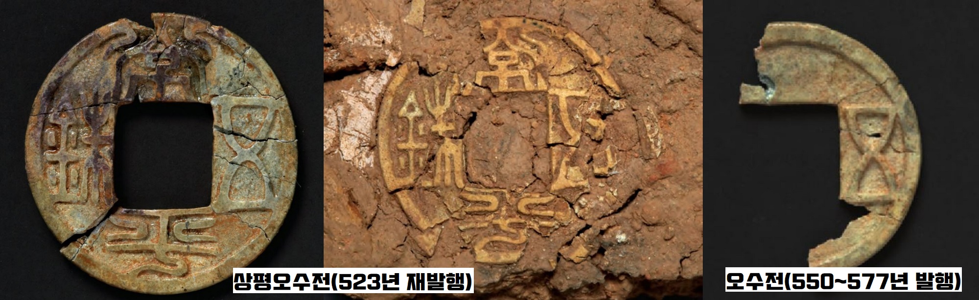 그중 상평오수전(常平五銖錢) 2점과 오수전 1점 등이 주목을 끌었습니다. 한 무제 때(기원전 118년) 처음 유통된 오수전은 640여 년 뒤인 523년(양 무제 4) 다시 제작된 동전이구요. 오수전은 북제시대(550~577년)에 제작됐다가 유통이 중단된 화폐입니다. 백제가 당시 중국의 남북조와 동시에 활발한 교역을 했다는 증거가 돼죠.