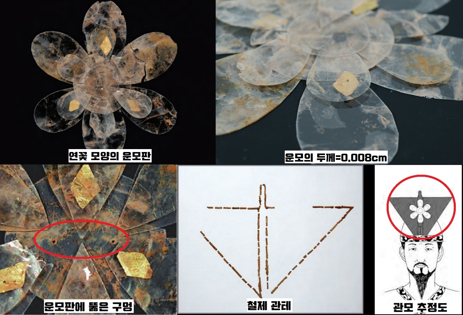 연꽃모양의 운모판은 관모 장식 테 중앙부에 얹혀진 상태였습니다. 원형의 운모판에 작은 구멍이 뚫려 있었구요. 이 구멍에 끈을 연결해서 관모에 장식했던 게 분명합니다. 운모는 도교신앙에서 불로장생을 기원하는 신선의 약재로도 알려져 있습니다.