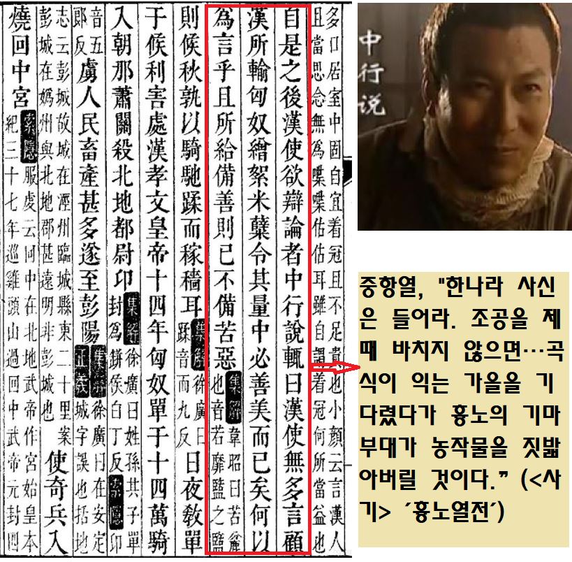 중항열이 “너희 한나라는 조공이나 바쳐라. 그렇지 않으면 우리(흉노)는 곡식이 익는 가을을 기다렸다가 기마병을 출동시켜 너희 농작물을 확 짓밟아 놓을 것(候秋孰 以騎馳蹂乃稼穡也)”이라고 위협했다는 겁니다.