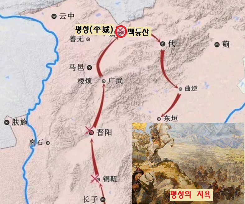 흉노는 이제 막 건국한 신생국인 한나라를 압박합니다. 그러자 한고조 유방이 32만명을 동원, 친정에 나섭니다.(기원전 200) 그러나 고조와 한나라군을 유인한 묵돌은 평성(산서성 대동시·山西省 大同市)에서 대대적인 반격을 가합니다.