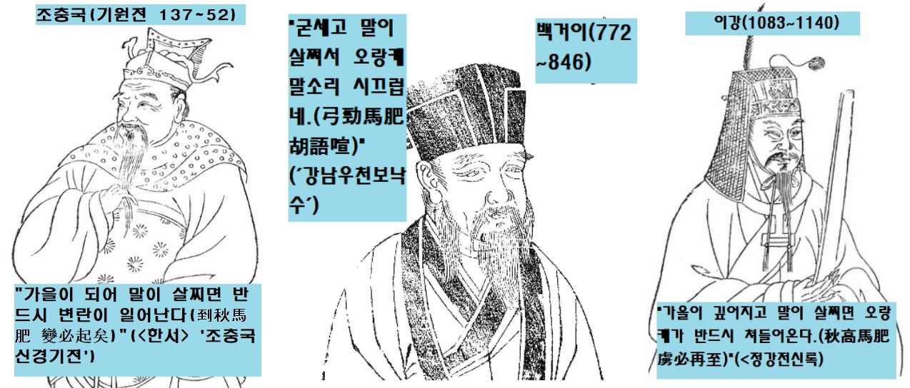 다만 전한의 장수인 조충국(기원전 137~52)이 기원전 62년 한 선제(기원전 73~48)에게 올린 상소문에 “가을이 되어 말이 살찌면 반드시 변란이 일어난다(到秋馬肥 變必起矣)”(<한서> ‘조충국 신경기전’)고 경고하는 내용이 있습니다.