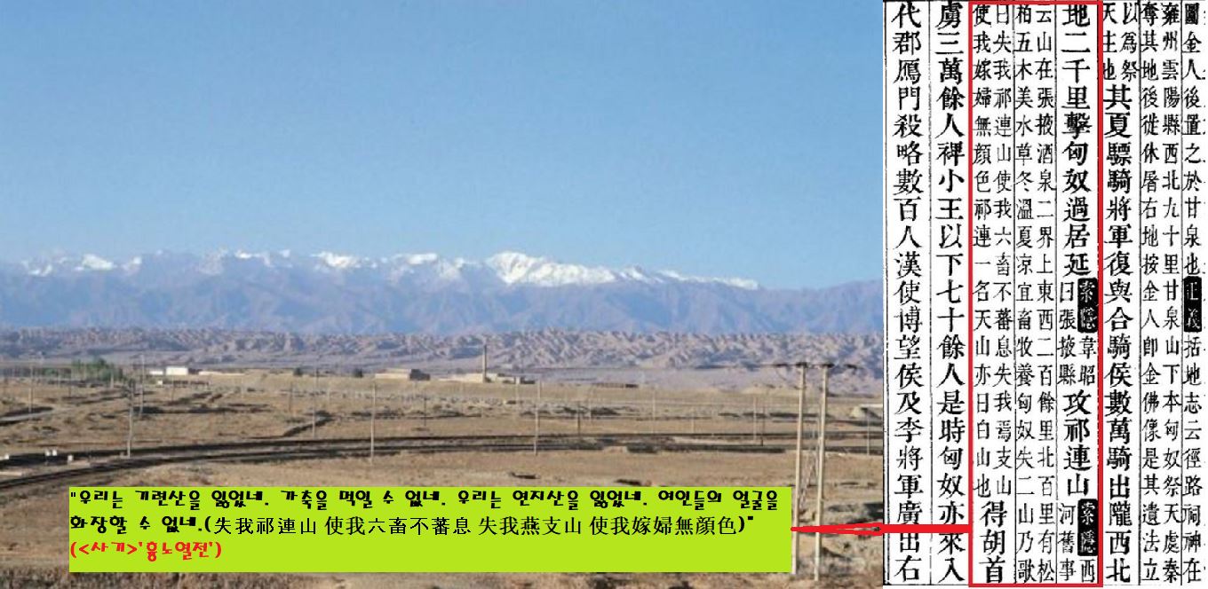“우린 기련산을 잃었네. 이제 가축을 먹일 수 없네. 우린 연지산을 잃었네. 여인들의 얼굴을 화장할 수 없네.(失我祁連山 使我六畜不蕃息 失我燕支山 使我嫁婦無顔色)”(<사기 색은>)