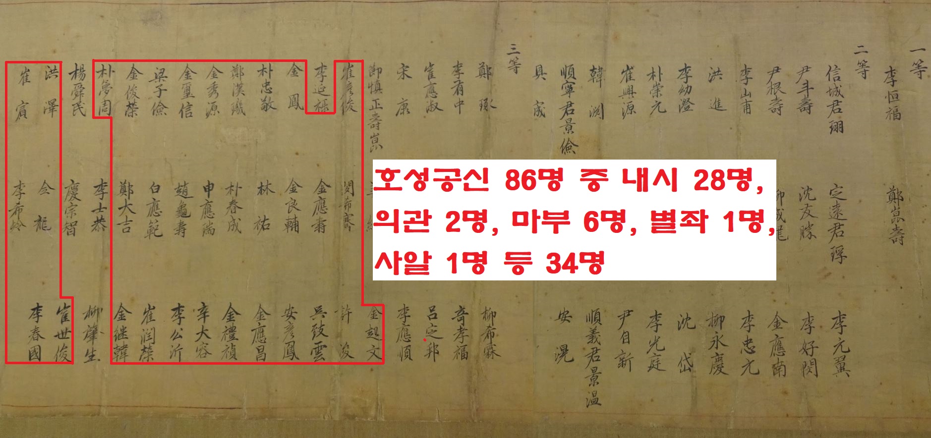 내시가 24명이나 포함됐구요. 임금의 말(馬)을 관리하는 이마(理馬) 6명, 의관 2명, 왕명을 전달하는 별좌(5급)와 사알(6급)이 2명이 들어갔습니다. 의관 중에는 <동의보감>을 편찬한 의성 허준(1539~1615·호성 3등)도 포함됐죠.