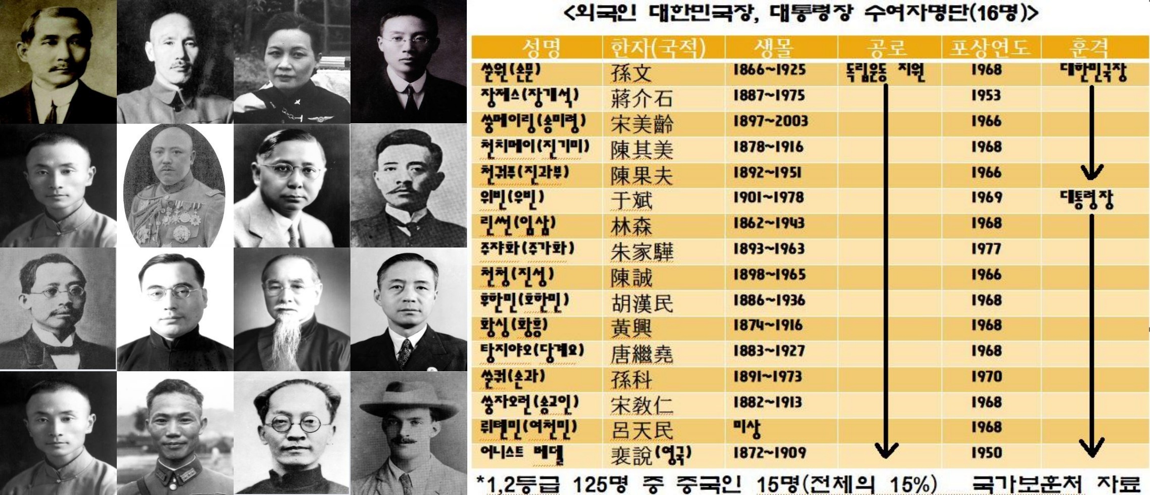 5명 모두 중국인입니다. 이중 중국 혁명의 아버지인 쑨원(손문·1866~1925), 중국 국민당 주석이자 중화민국 총통을 지낸 장제스(장개석·1887~1975)와 그 부인인 쑹메이링(송미령·1897~2003) 정도는 아실 거구요. 이 세 분은 대한민국 임시정부(쑨원)와 독립운동(장제스·쑹메이링)을 지원한 공로로 최고등급인 대한민국장을 받았답니다.