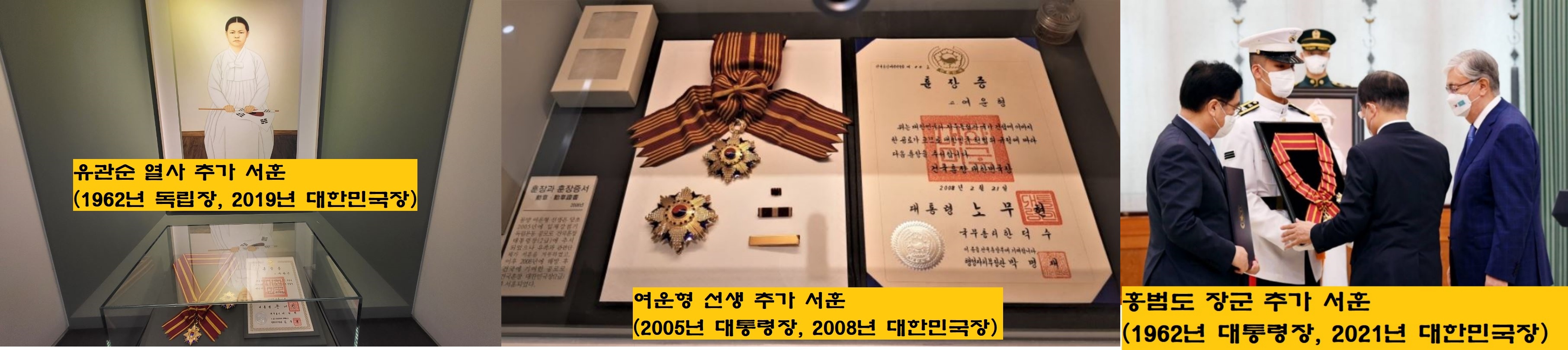 유관순 열사의 경우 ‘3·1만세운동에 참여한 뒤 순국한 공적’으로 받은 ‘대통령장’ 외에 ‘비폭력·평화·민주·인권의 가치를 드높인 공적’으로 ‘대한민국장’을 추가로 받았습니다. 여운형 선생은 기존의 ‘대통령장’외에 ‘해방 이후 대한민국 건국 및 민족통일을 위해 헌신한 공적’이 인정되어 ‘대한민국장’을 더 받았습니다. 홍범도 장군(1868~1943)은 2021년 카자흐스탄에서 유해가 송환된 것을 계기로 기존의 대통령장(2등급) 외에 대한민국장(1등급)을 ‘추가’했습니다. 하지만 현행 상훈법에 따라 재심사 절차가 마련되어 있지 않으니 유관순 열사와 여운형 선생, 홍범도 장군의 사례가 왠지 편법 같다는 생각이 듭니다.