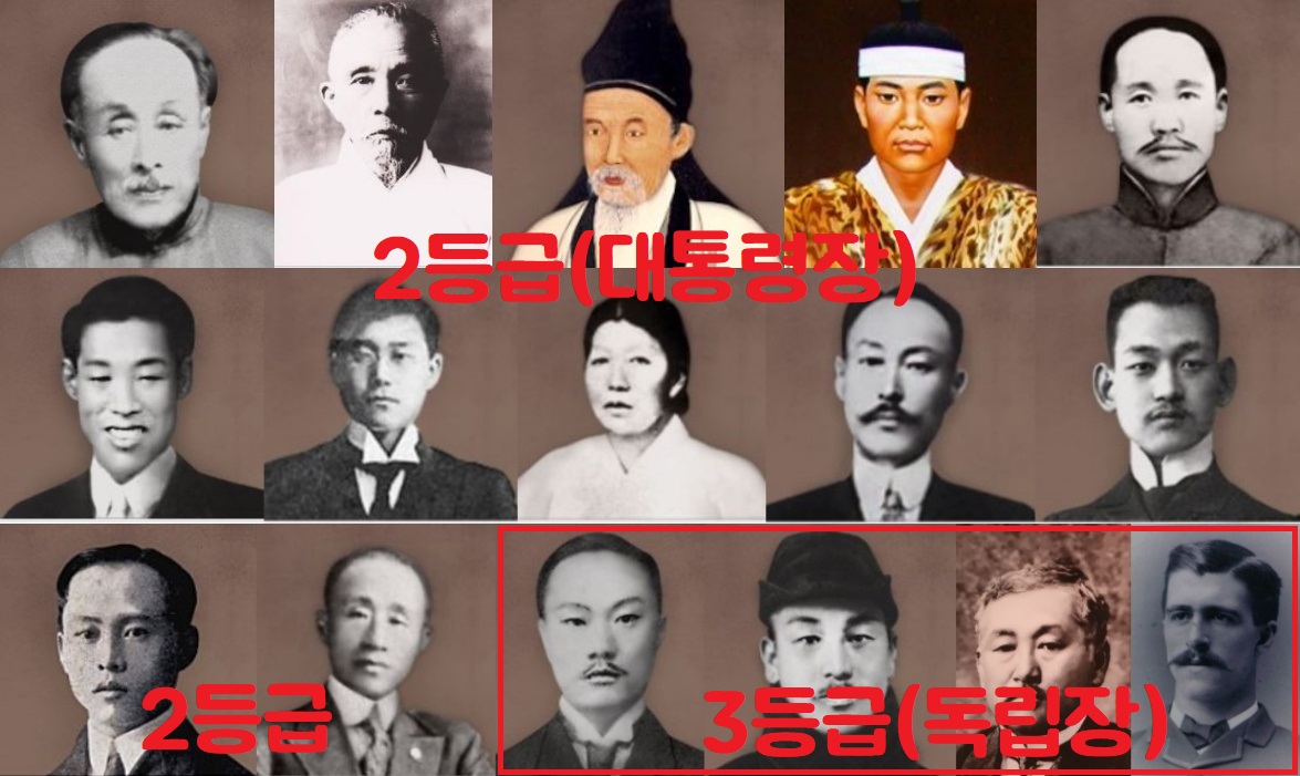 의병장 유인석(1842~1915)·신돌석(1878~1908), 일왕에게 수류탄을 던진 이봉창(1901~1932), 헤이그 특사 이상설(1870~1917)·이위종(1887~?), 매국노 이완용을 습격한 이재명(1887~1910), ‘여자 안중근’ 남자현(1872~1933), 친일 외교고문 더럼 스티븐스를 처단한 전명운(1884~1947)·장인환(1876~1930) 선생 등이 2등급인 대통령장을 받았습니다.