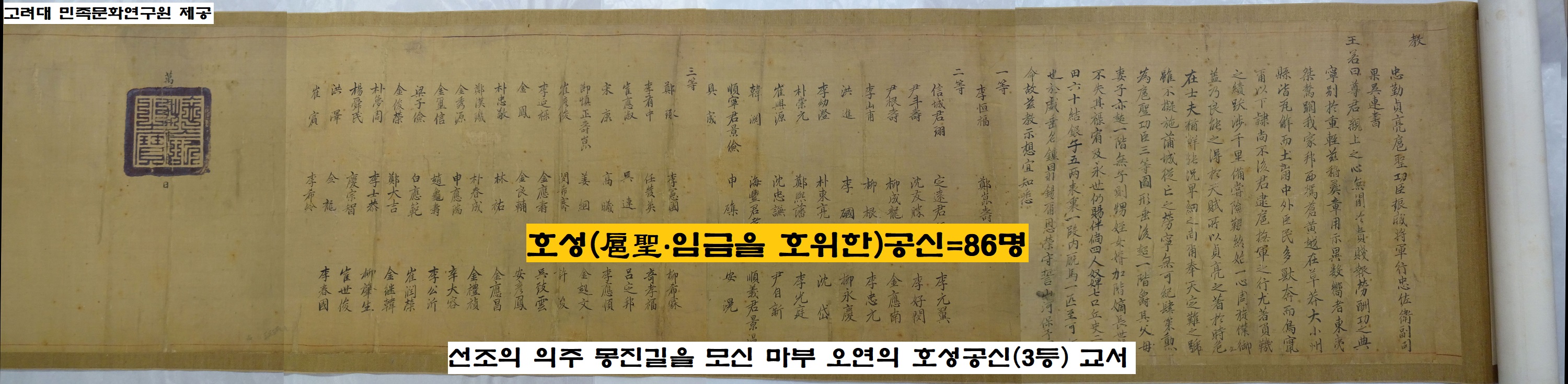 사관들의 논평을 정리해볼까요. 하나는 공신 중에 허접한 인물들이 너무 많다는 것이고, 다른 하나는 곽재우 등 의병들의 공이 너무 폄훼되었다는 겁니다. 대체 어떤 내막이 있었을까요. 6월25일 발표된 공신은 세 부류로 나뉘었는데요. 임진왜란 때 선조의 의주행을 수행한 86명은 ‘호성(扈聖)공신’이 됐습니다.