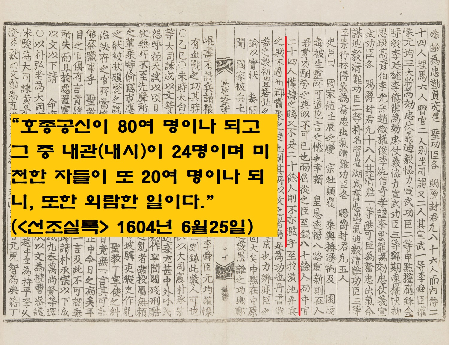 “호종공신이 80명이 넘는다니 과하다. 그 중 내시가 24명이며 미천한 자들이 또 20여명이다”(6월 25일)고 했구요. 또 “천한 것들과 함께 공신회맹연에 참석했으니…아! 어찌 비웃음을 사지 않겠는가”(10월 29일)고 한탄하는 기사가 있네요. 그중 6월25일 발표된 선조의 공신 교서 내용을 전한 사관의 논평이 의미심장합니다.