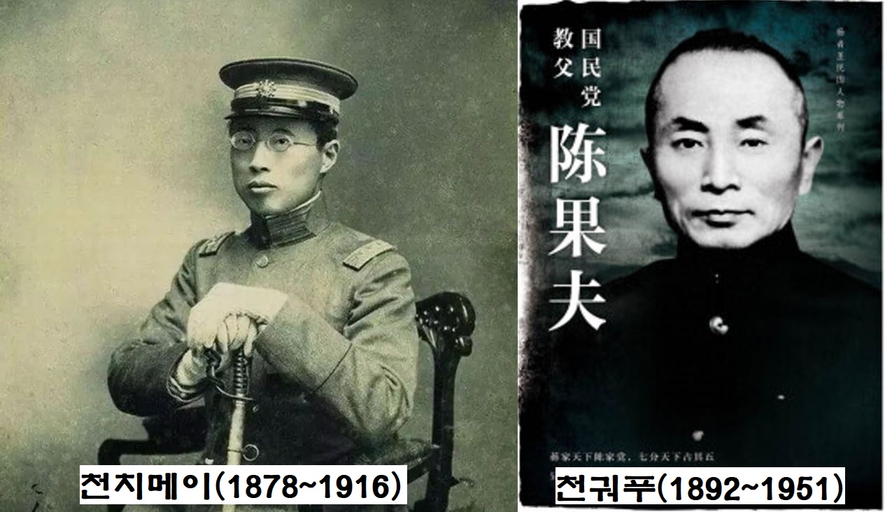 천치메이는 1910년대에 신규식(1879~1922) 선생과 함께 신아동제사를 조직하여 한·중 혁명 활동을 전개했답니다. 천치메이의 조카인 천궈푸는 1913년 조소앙(1887~1958)·신규식 선생 등과 함께 대동당을 조직해 항일 합동 투쟁을 전개했구요. 1942년 중국 정부의 중앙조직부장으로서 광복군과 함께 항일전을 벌이기도 했습니다.