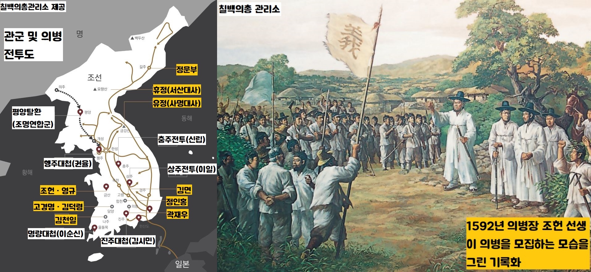 그렇게 임금이 도망쳤지만 어땠습니까. 전국 각지에서 그 못난 임금을 향한 충성심 때문에, 부모형제를 위한 효심 때문에, 수천 수백년 동안의 터전이었던 고향을 지키기 위해 분연히 일어섰죠. 이 분들이 사대부를 중심으로 천민에 이르기까지 전국 각지에서 활약한 의병들이었죠. 다급했던 선조는 처음에는 의병장들에게 관직을 제수하는 등 의병의 봉기를 크게 북돋아주었죠.