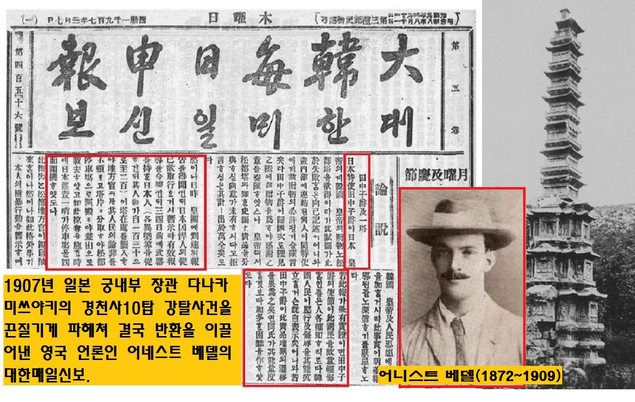 이후 통감부의 탄압에 맞서 한국의 국권수호를 위해 필봉을 휘둘렀죠. 헐버트와 함께 일본 궁내부 장관 다나카 미쓰야키(田中光顯·1843~1939)의 경천사 10층탑 강탈사건을 집요하게 파헤쳐서 반환을 이끌어냈구요. 베델은 독립유공자 서훈에서 2등급(대통령장)을 받았습니다. 저는 결단코 베델의 서훈 등급을 문제삼는 것이 아니구요. 평생을 한글 연구와 보급, 그리고 한국의 독립운동에 바친 헐버트 박사가 3등급인게 잘못됐다는 점을 말씀드리는 겁니다. 또 헐버트(3등급)와 베델(2등급)의 서훈 등급이 같은 외국인으로서 1등급 대우를 받은 천궈푸, 천치메이에 견줘 낮은 건지도 의문이 듭니다.