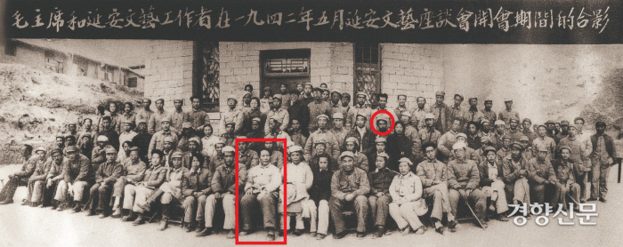 1942년 5월 옌안 문예 좌담회를 마친 뒤 기념촬영을 한 모습. 정율성은 그곳에서 ‘팔로군행진곡’과 ‘옌안송’, ‘엔수이야오’ 등 항일 운동을 대표하는 곡들을 발표했다.|(출처:바이두 사진을 토대로 이종한의 <정율성 평전>에서 정율성의 얼굴 표시)