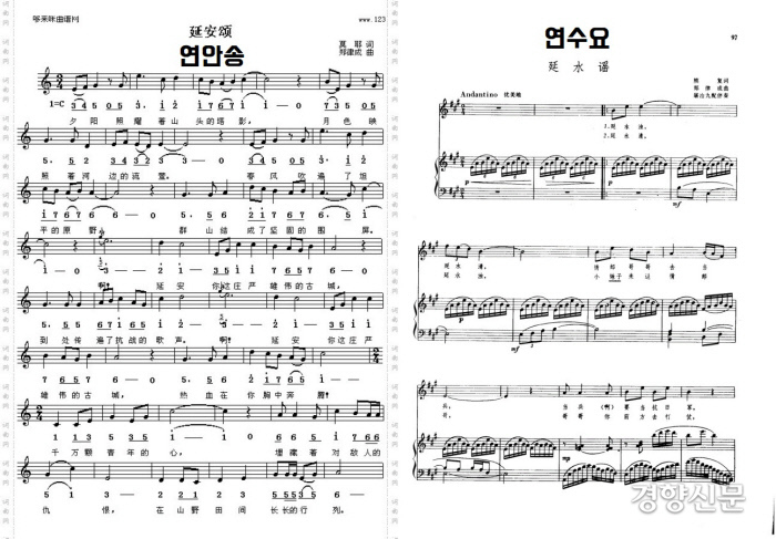 정율성이 작곡한 서정가요인 ‘옌안송(연안송)’과 ‘옌수이야오(연수요)’. 옌안송은 한국 민요 ‘낙화암’ 음조의 기초로 한 중국 최초의 서정송가로 꼽힌다. 이곡을 듣는 젊은이들이 항일투쟁 대열에 합류했다고 한다. ‘옌수아야오’는 항일전쟁의 승리를 위하여 군대에 가는 정든 임을 배웅하는 애정을 표현한 곡이다.