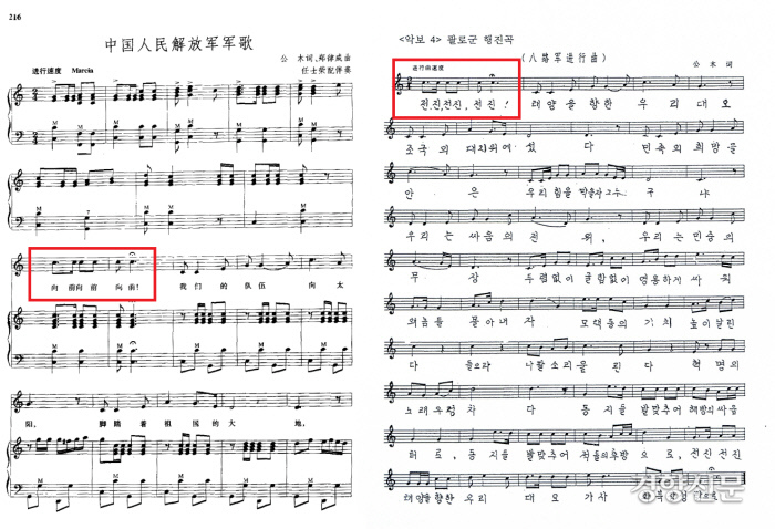 정율성이 1939년 옌안에서 작곡한 ‘팔로군행진곡’. 처음의 가사 중에는 ‘전진(向前)! 전진(向前)! 전진(向前)!’ 부분이 없었다. 그러나 정율성이 “노래 시작 부분이 어딘가 기백이 부족하다”면서 ‘전진!’을 세 번 넣었더니 노래가 살아났단다. ‘팔로군행진곡’은 1988년 7월 25일 ‘중국 인민해방군 군가’로 공식 지정됐다. |김성준의 논문에서