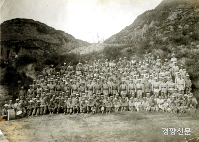 1945년 9월 옌안 나지핑(羅家坪). 1945년 9월 정율성과 항일운동 단체인 조선독립동맹의용대, 조선군정간부 300~400명이 북한으로 떠나갈 때의 모습.|정율성 선생기념사업회·광주문화재재단 제공
