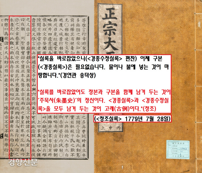 그러자 정조는 “우리나라 실록 중에서도 수정본과 구본을 함께 남겨 둔 일도 있다”면서 ‘주묵사’ 정신을 거론하면서 “수정본과 구본을 모두 남겨 두는 것은 또한 옛 법”(<정조실록> 1779년 7월28일)이라고 일축했습니다.