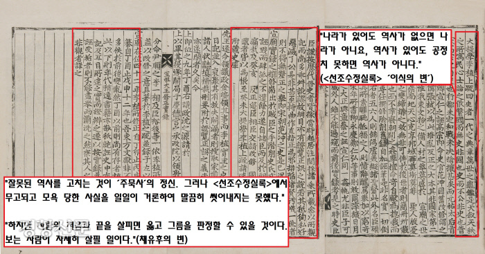 “역사기록에는 잘못된 곳이 많기 때문에 갖가지 수정서 및 해석서가 나오는 것입니다. 그래서 잘잘못을 바로잡을 수밖에 없으니 송나라 범충의 ‘주묵사’가 그것입니다…실록은 신구본을 모두 보존하여 이 ‘주묵사’처럼 참고하도록 하였습니다.”(<선조수정실록> 후기 및 1657년 10월5일조)