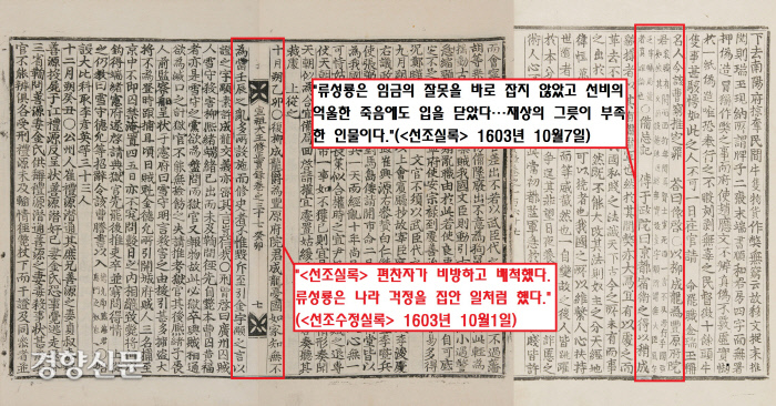 1)“류성룡은 임금의 잘못을 바로 잡지 않았고 선비의 억울한 죽음에도 입을 닫았다…재상의 그릇이 부족한 인물이다.”(<선조실록> 1603년 10월7일)
