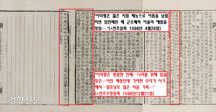 2)“이덕형은 젊은시절 재능으로 이름을 날렸지만 임진왜란 때 군소배와 어울려 예절을 상실….”(<선조실록 1598년 4월26일)“이덕형은 청렴한 인재라는 중망으로…나라를 위해 집을 잊은…어진 재상인데 기자헌 무리가 시기해서…얼토당토 않은 사실 기록….”(<선조수정실록 1598년12월21일)