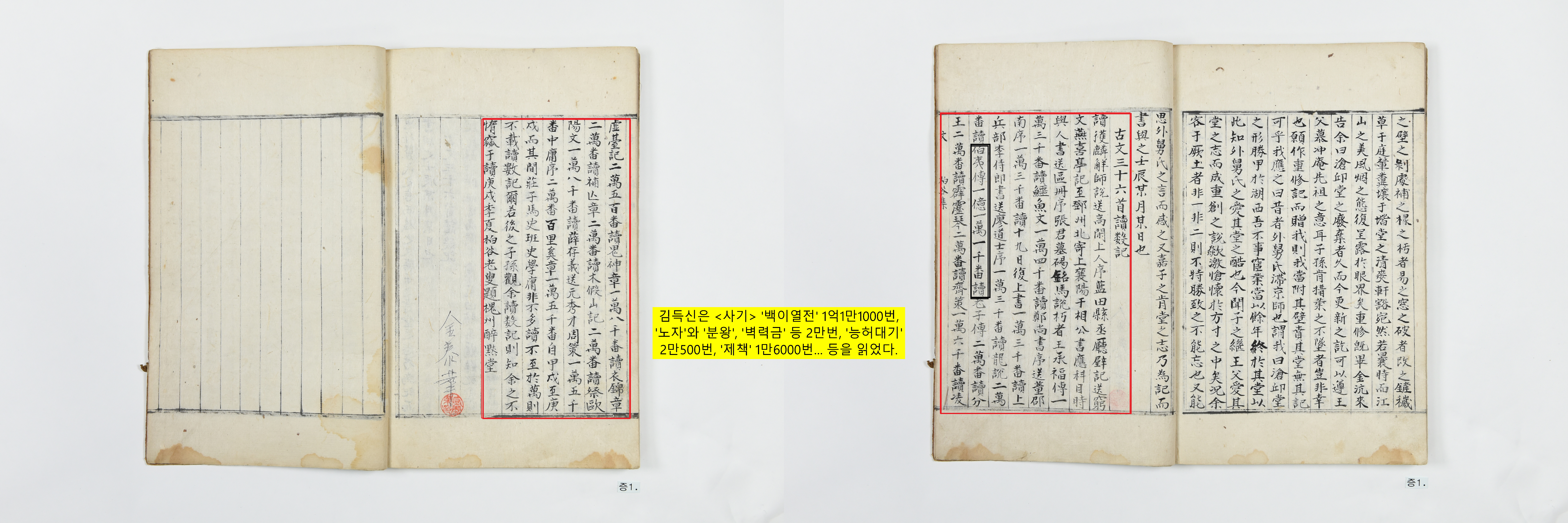 기가 막히지 않습니까. <사기> 중 ‘열전·백이열전’ 편을 1억번 이상 읽었다는 것도 놀랍지만 1만4000번 이상 읽은 책의 편수가 36편이랍니다. 무엇보다 “읽은 회수가 1만번이 넘지 않은 <장자>와 <사기>, <대학> 등은 기록에서 뺀다”고 했다는 것이 놀랍습니다. 1만번 이상 읽지 않은 책은 ‘읽은 축’에도 치지 않았다는 겁니다. 오죽하면 서재 이름을 ‘억만재’라 지었겠습니까.