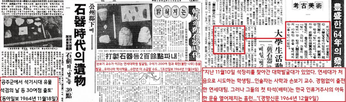 “손보기 교수가 이끄는 연세대학원 발굴팀, 구석기 200여 점과 목탄(불탄 나무) 등을 발굴…우리나라 역사책을…수만년 더 소급할 수도…”(조선일보 1964년 11월24일)