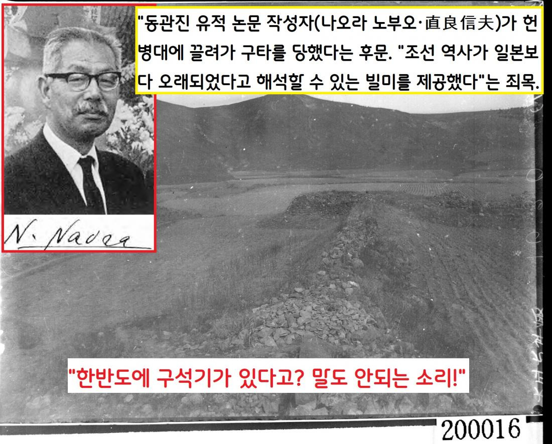 그래서 1935년 동관진에서 구석기 추정 유물이 출토되고, 그것을 논문으로 써서 학계에 보고(1940) 했어도 ‘말도 안되는 소리’로 폄훼됐다. 실제로 동관진 유적의 논문 작성자(나오라 노부오·直良信夫)가 헌병대에 끌려가 구타를 당했다는 이야기도 전해진다.