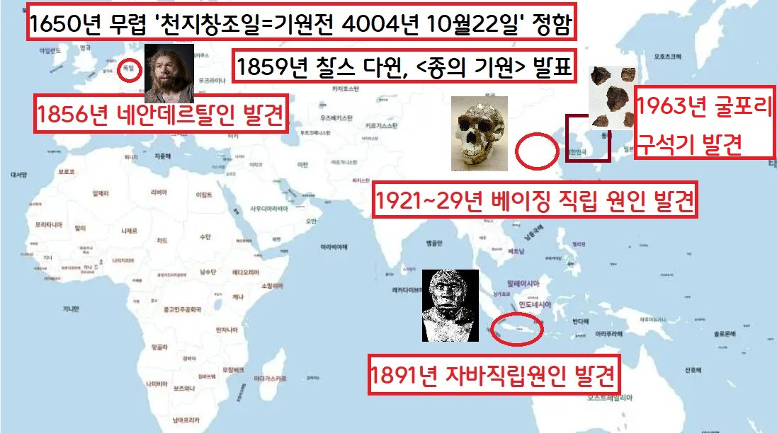 ②1856년 독일 뒤셀도르프 인근의 네안더 골짜기 석회암 동굴에서 괴상한 화석이 다수 발견됐다. 엉덩이뼈와 눈 윗부분이 툭 튀어나온 ‘돌출이마’는 ‘사람 같은데 사람 같지 않은 사람들의 뼈’(훗날 네안데르탈인으로 명명) 였다. 3년 뒤인 1859년 찰스 다윈(1809~1882)이 <종의 기원>에서 진화론을 펼친다. ‘창조론자’들은 “맙소사! 우리가 원숭이의 후손이었다는 말이냐”고 외쳤다.