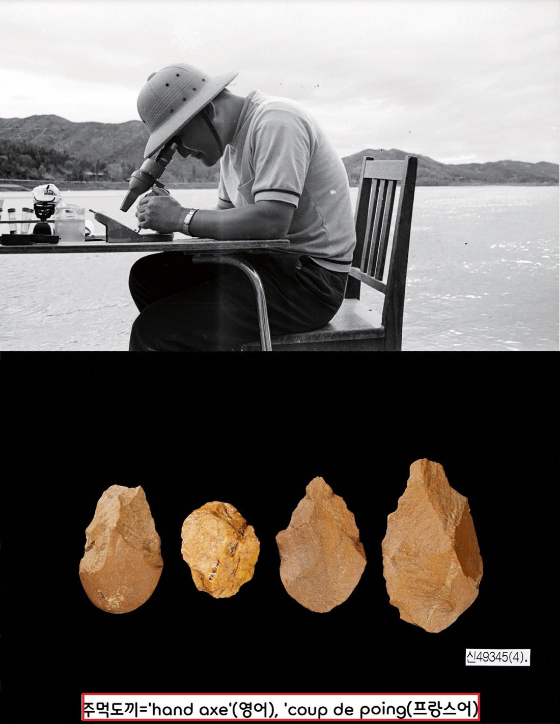 1964년 11월 초 금강변인 충남 공주 석장리 1차 발굴에서 찾아낸 구석기 시대 주먹도끼. 한반도 남부에서 확인된 첫번째 구석기 유적이다.|연세대박물관 제공