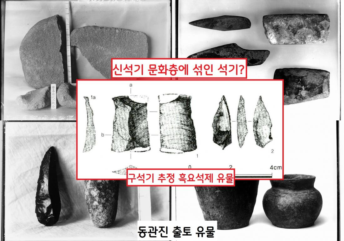 동관진 유적에서 출토된 흑요석제 2점이 구석기가 맞냐는 논란은 현재까지 제기되고 있다. 신석기 시대 문화층과 혼합된 석기라 믿을 수 없다는 주장이 지금까지도 나온다.|국립중앙박물관 소장·장용준 국립진주박물관장 논문