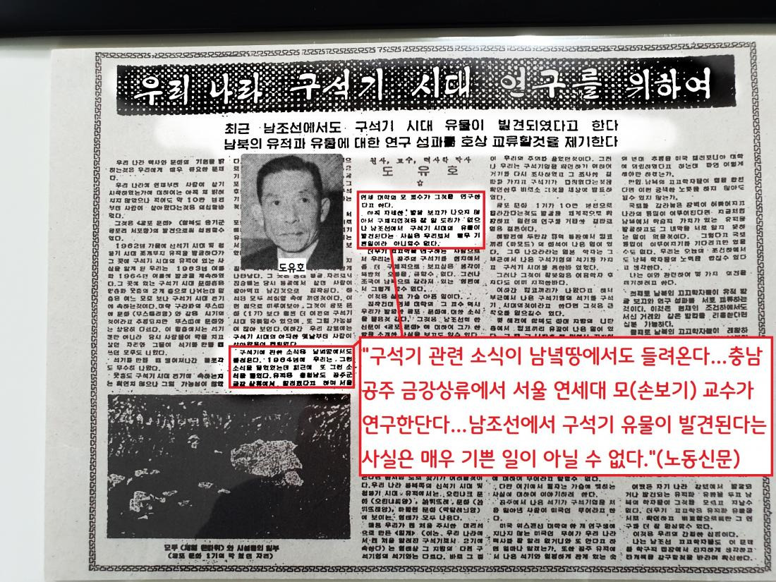 “구석기 관련 소식이 남녘땅에서도 들려온다…충남 공주 금강상류에서 서울 연세대 모(손보기) 교수가 연구한단다…남조선에서 구석기 유물이 발견된다는 사실은 매우 기쁜 일이 아닐 수 없다.”